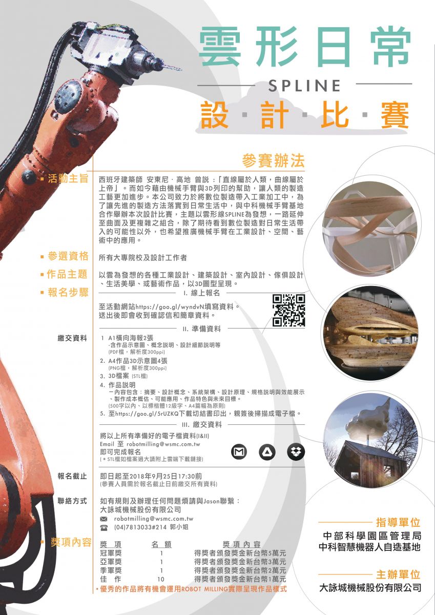 西班牙建築師 安東尼‧高地 曾說 :「直線屬於人類,曲線屬於上帝」。而如今藉由機械手臂與3D列印的幫助,讓人類的製造工藝更加進步。本公司致力於將數位製造帶入工業加工中,為了讓先進的製造方法落實到日常生活中,與中科機械手臂基地合作舉辦本次設計比賽,主題以雲形線SPLINE為發想,一路延伸至曲面及更複雜之組合,除了期待看到數位製造對日常生活帶入的可能性以外,也希望推廣機械手臂在工業設計、空間、藝術中的應用。